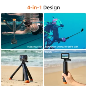Uporablja se lahko kot selfie palica, vrtljivi ročaj in stojalo, lahko pa lebdi na vodi. Njegova največja višina je 60 cm, kar vam daje skoraj neomejene možnosti. Združljiv je z večino športnih kamer, ki so na voljo na trgu.